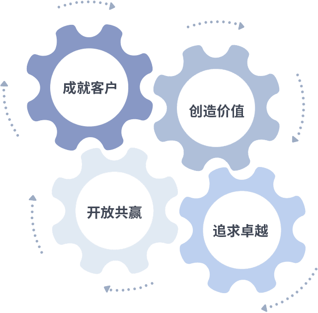 成就客户是一切决策的出发点,,,创造价值是衡量所有工作的标准,,追求卓越是我们做事做人的态度,,开放共赢是我们的格局也是最终的结果。。。。价值观的齿轮环环相扣,,,,推动着组织里的每个人不断向前。。
